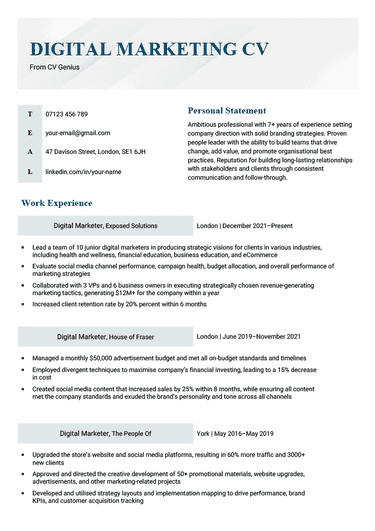 Eva Chan is a Digital Marketing Specialist & Certified Professional Resume Writer (CPRW) at CV Genius, with a background in the education management industry. Eva graduated from the University of British Columbia with a bachelor’s degree in English. She’s since coached a variety of people at different stages of their career paths: interns, undergraduate and graduate students, managers, and C-suite executives.