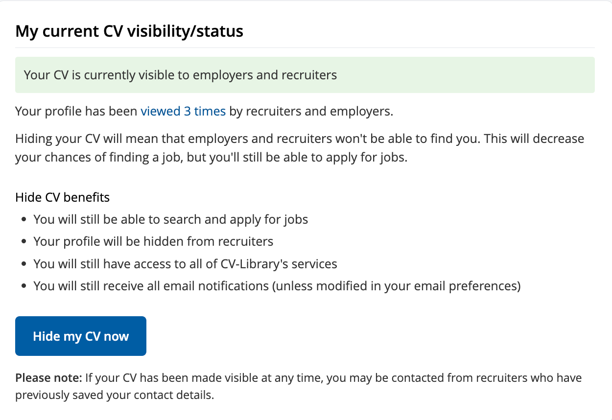 We’d still advise you to protect your privacy on CV Library. For example, if you only want companies you apply to to be able to see your CV, you should hide your CV from public view by going to ‘My Settings’ under your name in the menu bar, then clicking ‘Hide My CV’: