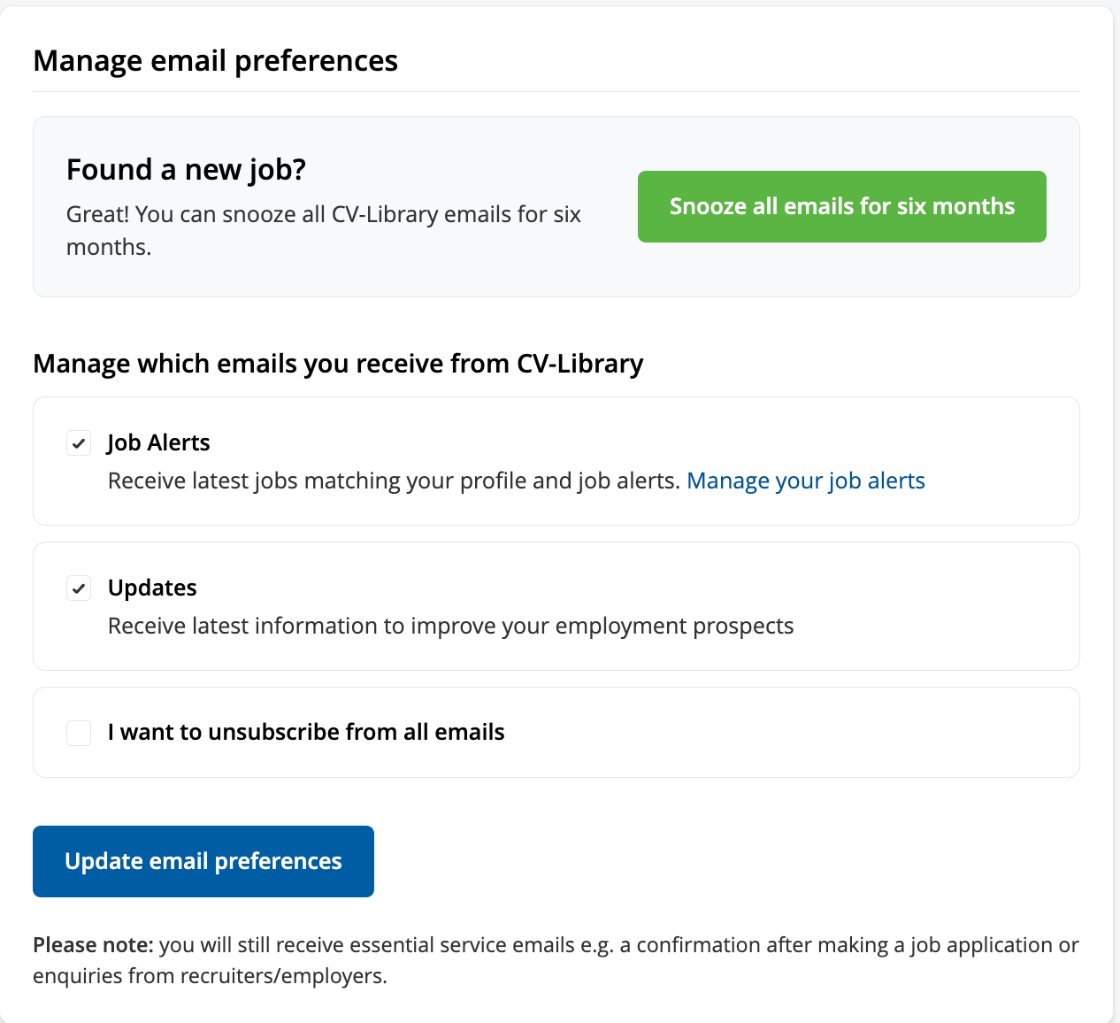 To unsubscribe from CV Library emails, click ‘My Settings’ under your name in the menu bar, then scroll down to ‘Manage Email Preferences’. You can click the button to pause emails for six months or opt out of job alerts or site updates: