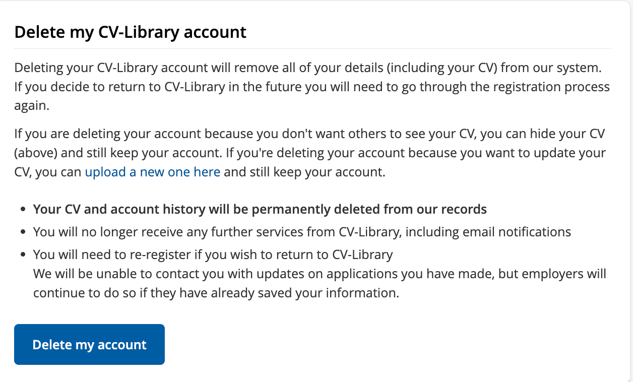 You remove your CV from CV Library by deleting your CV Library account. Unfortunately, there’s no other way to remove your CV (although you can hide your CV from recruiting managers if you’re concerned about your privacy).
