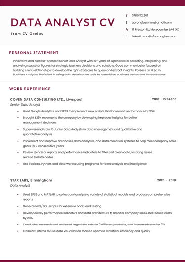 Here’s an example of what an experienced business analyst personal statement should look like: